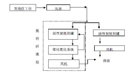本項目采用“收集+預處理+活性炭吸附、脫附裝置處理+催化燃燒”主要包括以下兩個部分: 1)經(jīng)過預處理后的廢氣,經(jīng)活性炭吸附系統(tǒng)處理后通過排氣筒高空排放。 2)活性炭飽和后利用熱空氣進行脫附,脫附后氣體經(jīng)過催化氧化系統(tǒng)進行進一步處理凈化后排放。